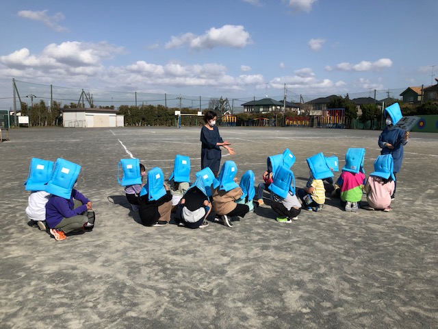 (右)避難訓練(お・か・し・も をしっかり守って命を守る真剣な訓練です。)