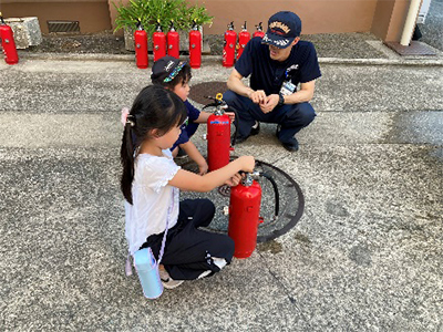 9月6日(金)の「消防体験塾」では、磯子消防署の消防士さんが来て、消火訓練、119通報訓練、煙体験などを楽しく教えてくれました。