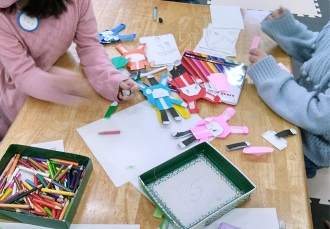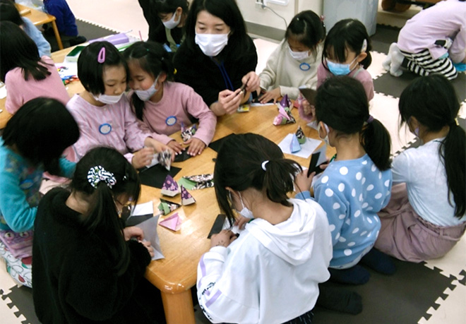 豊岡小学校放課後キッズクラブでは、毎日楽しく子ども同士でボードゲーム・読書、将棋などで遊んでいます。 また、外国人英語講師による「英語で遊ぼう!」やタオルアートといった工作を行っています。 海外の言葉や文化を遊びながら学んでいきます。タオルアートは先着順で大人気でした!