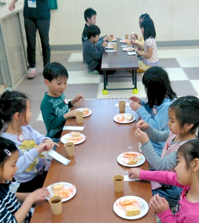 子どもたちの楽しみの一つでもあるおやつ。 マナーやアレルギー対応・衛生面にも意識をして子どもとのひと時を過ごしています。