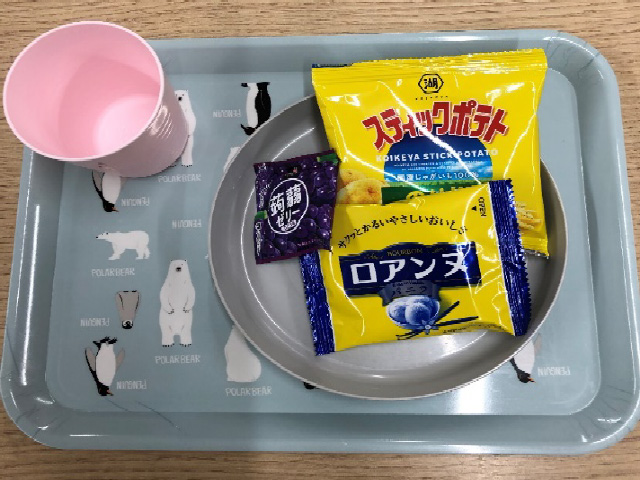 おやつ時間は16:30からで毎日決めた席に座りバラエティー豊かなメニューを食べています。アレルギー児童に対しては家庭より持参して頂き、他の児童と間違えない様に細心の注意を払い提供しております。